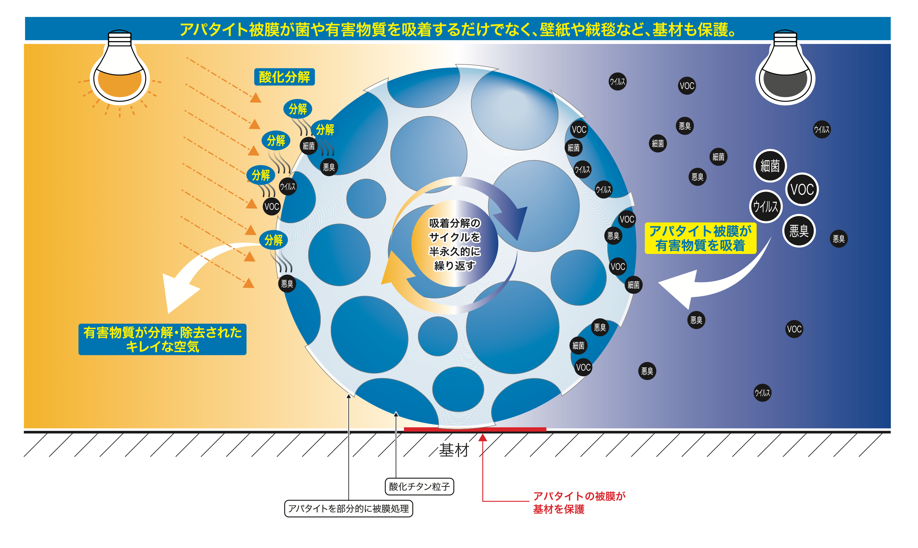 施工する部屋にある、壁紙やテーブルなど物体に対して「アパタイト」で保護! 室内照明で応答する“灯触媒”のフォトンフレッシュ。 分子レベルの酸化分解によって、テーブルや壁紙など、物質を攻撃(分解)してしまうことのないように アパタイト で保護している。